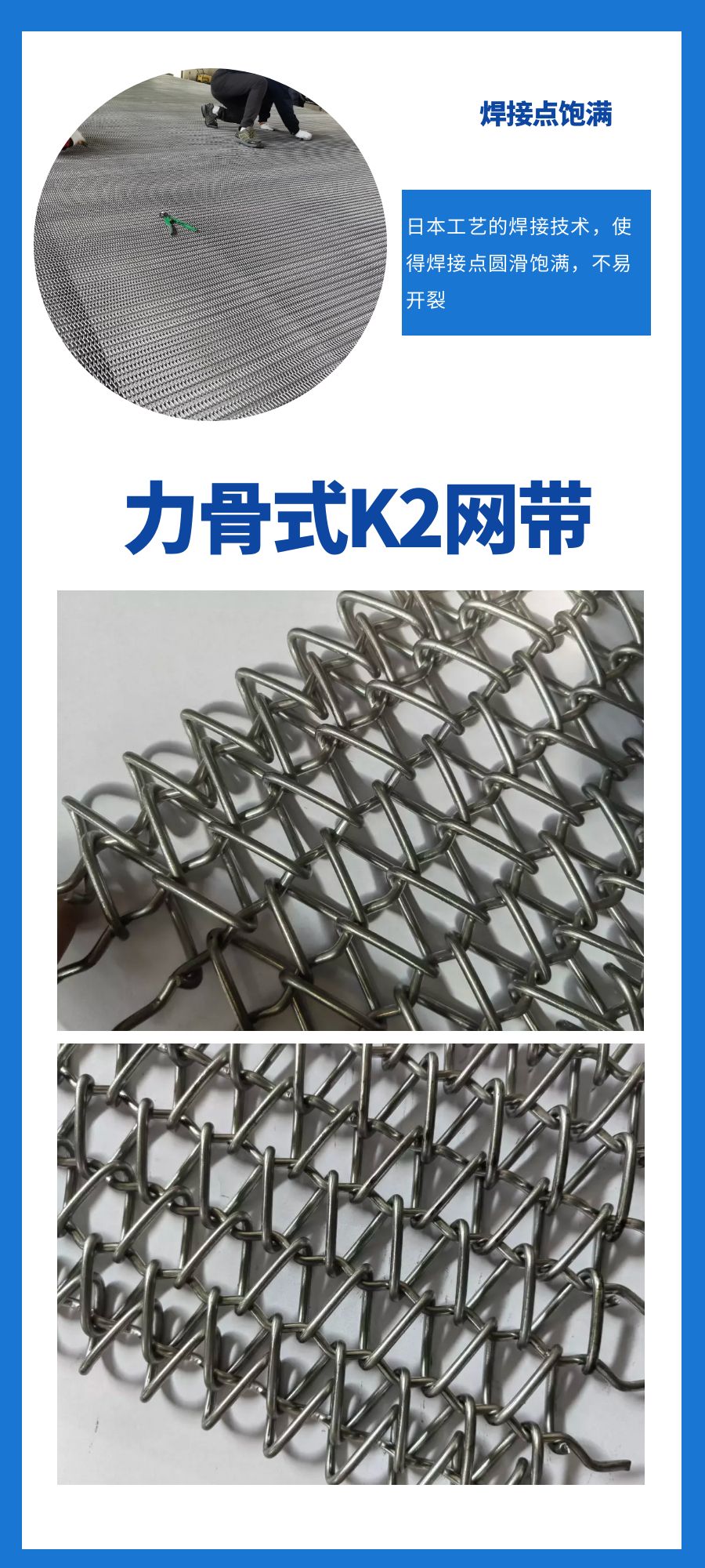 源自日本臺(tái)灣的先進(jìn)網(wǎng)帶生產(chǎn)工藝,同時(shí)堅(jiān)持自主研發(fā),結(jié)合現(xiàn)代工業(yè)需求,具有等商子焊、網(wǎng)帶去油脂處理、扁線編織等多種特殊工藝。 | ![]() |