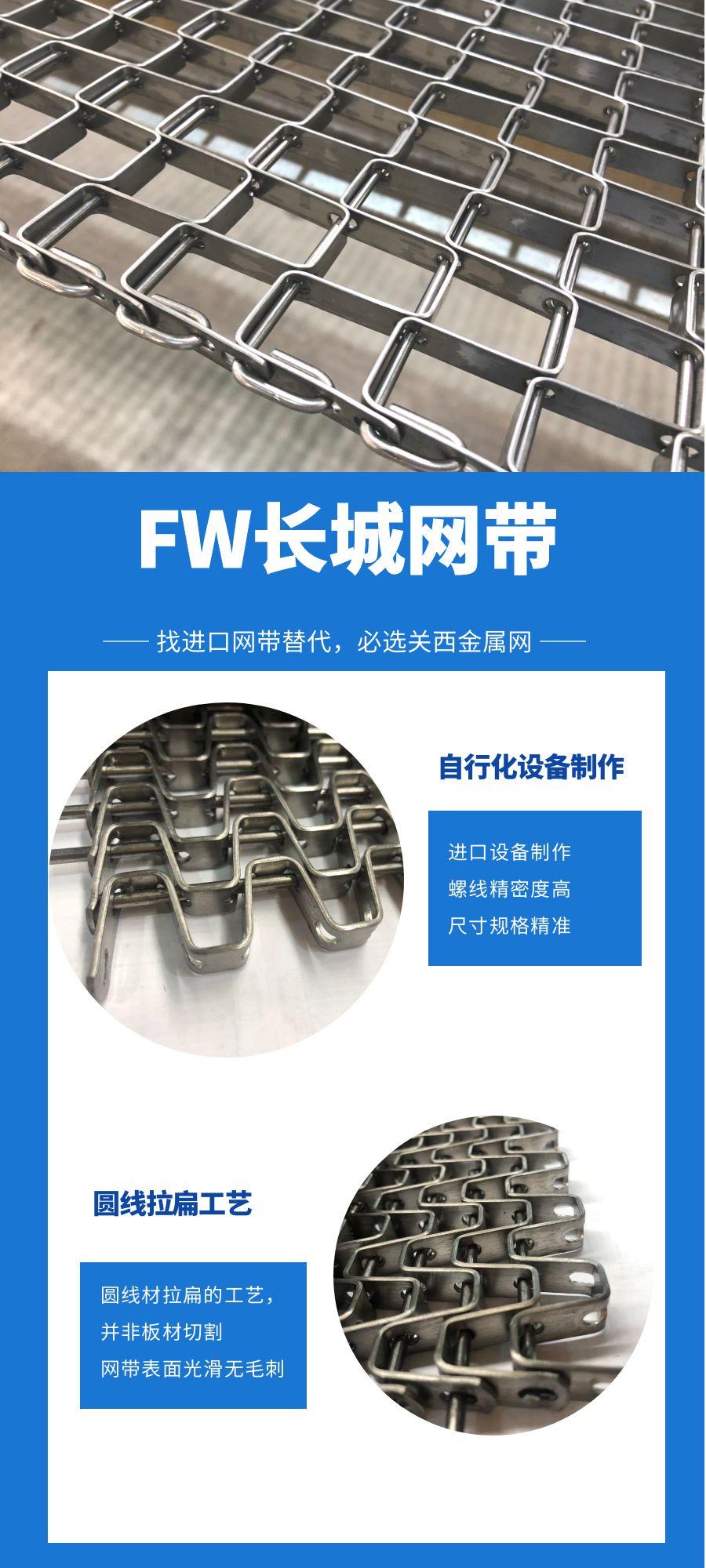 源自日本臺灣的先進(jìn)網(wǎng)帶生產(chǎn)工藝,同時堅持自主研發(fā),結(jié)合現(xiàn)代工業(yè)需求,具有等商子焊、網(wǎng)帶去油脂處理、扁線編織等多種特殊工藝。 | ![]() |